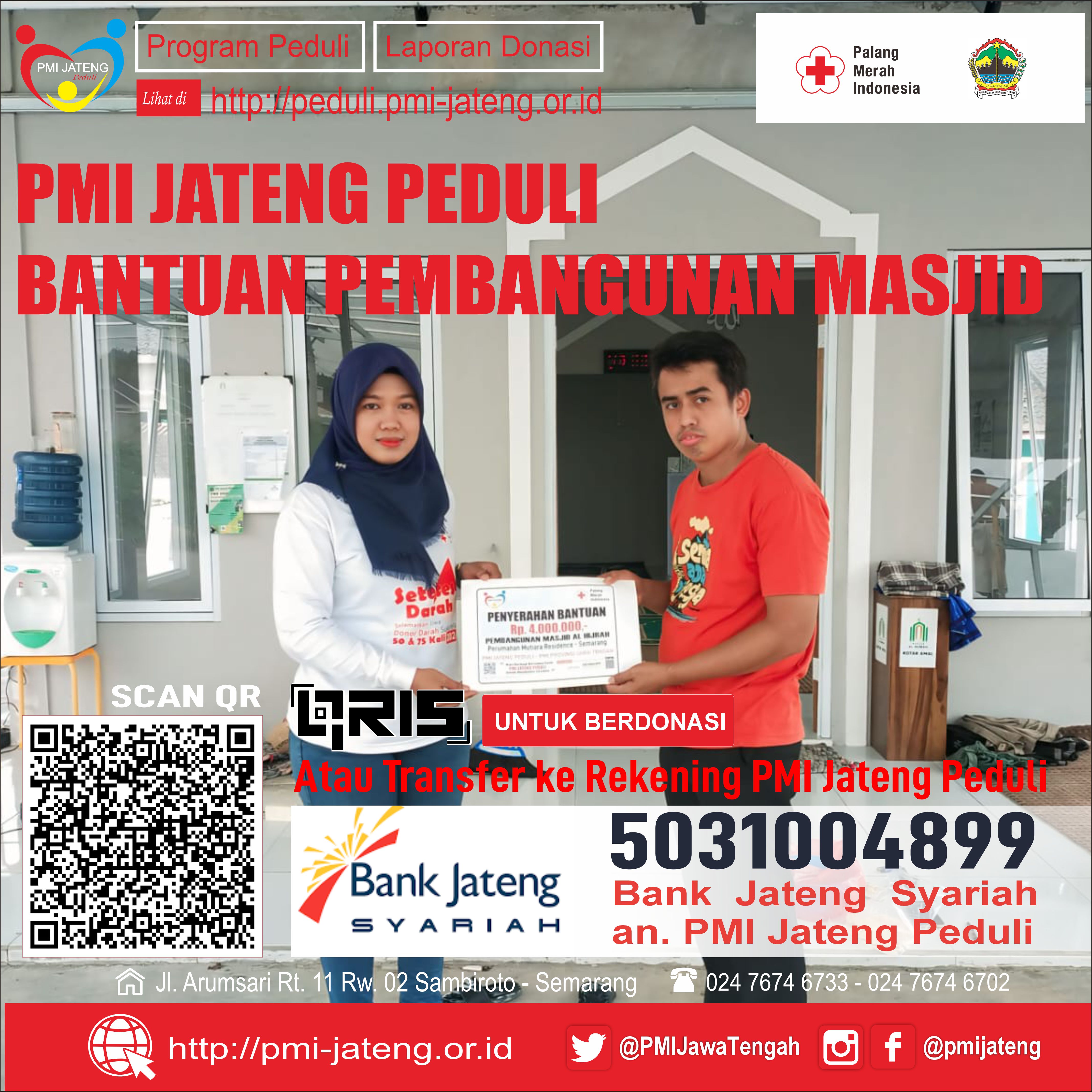 PMI Jateng Peduli Salurkan Donasi untuk Pembangunan Masjid Al Hijrah sebesar Rp. 4.000.000,-